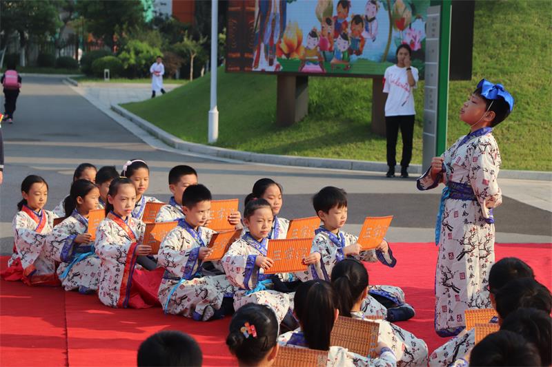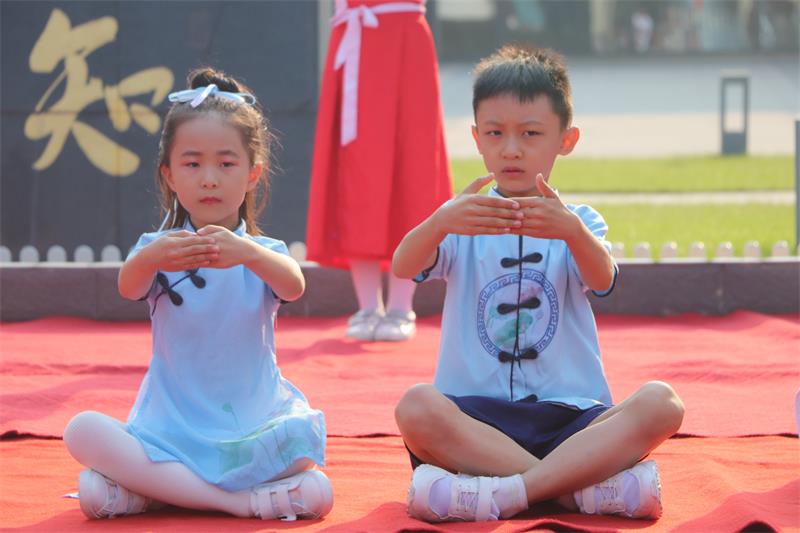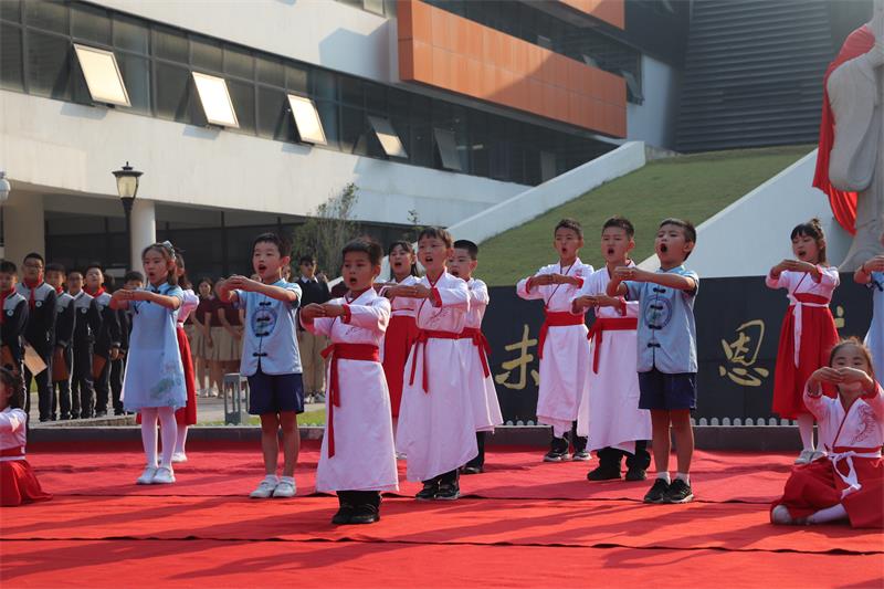 學(xué)生整齊站列身著漢服吟誦誓詞,向孔子像作揖行禮,誦讀誓詞。勵(lì)志成為謙虛謹(jǐn)慎、嚴(yán)格自省、品格高尚的樹恩人。而后,學(xué)生表演了《君子九思》《孔子爺爺》等節(jié)目。
